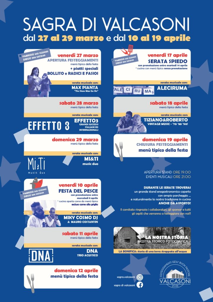 Cari amici della sagra “Gesù Buon Pastore” di Valcasoni, rieccoci all’edizione 2026 della nostra amatissima festività del Santo Patrono. Anche quest’anno siamo tornati carichi di entusiasmo e di nuove iniziative come la bellissima mostra fotografica de “La nostra storia” che rappresenta uno scorcio della vita di un tempo, testimonianza delle nostre radici, storie di una terra strappata all’acqua, curata da Mirco Brussolo. Il menù che vi proponiamo rimane quello inalterato delle nonne di una volta da sempre contraddistinto dalla qualità degli ingredienti preparati con cura e dedizione, SERVIZIO AL TAVOLO! Le serate saranno allietate da intrattenimenti con musica dal vivo e DJ set.